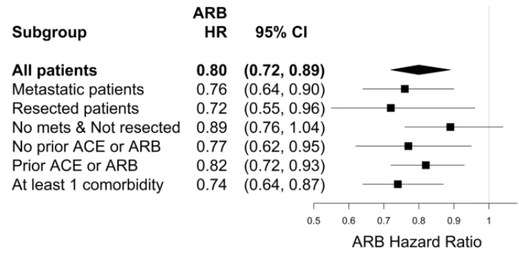 值得注意的是,與ACEI相關(guān)的死亡風(fēng)險(xiǎn)降低在三年生存期后不再明顯,而與ARB相關(guān)的死亡風(fēng)險(xiǎn)降低仍然存在。更重要的是,如果胰腺癌患者接受了手術(shù)治療,服用 ARB 死亡風(fēng)險(xiǎn)降低更大。