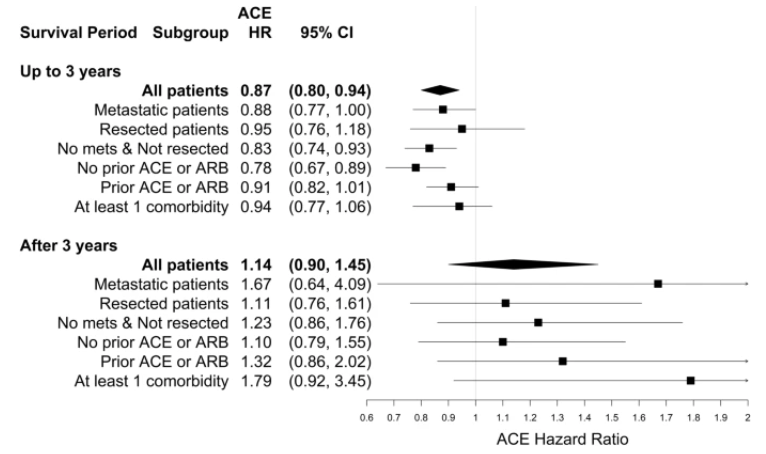 結(jié)果顯示,基于潛在混雜因素調(diào)整的 Cox 模型,與未服用 ACEI 或 ARB的癌癥患者相比,服用 ARB的胰腺癌患者死亡風(fēng)險(xiǎn)降低 20%,服用 ACEI的胰腺癌患者死亡風(fēng)險(xiǎn)降低 13%。