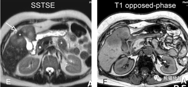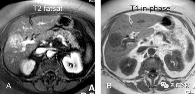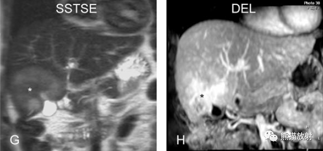 T2壓脂(T2 fatsat):膽囊窩內(nèi)膽囊癌病變較肝臟為高信號(hào),病變頂部向肝內(nèi)擴(kuò)展;