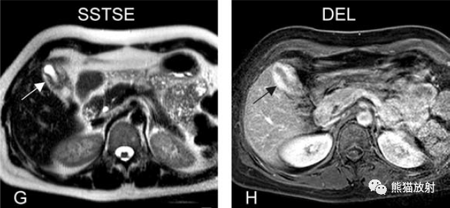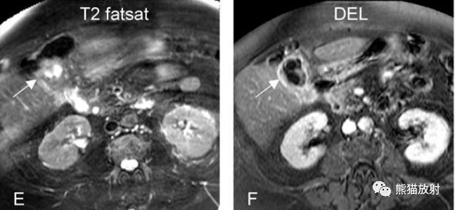 另一例膽囊癌,T2WI及增強(qiáng)延遲期顯示膽囊壁不均勻增厚并明顯強(qiáng)化。