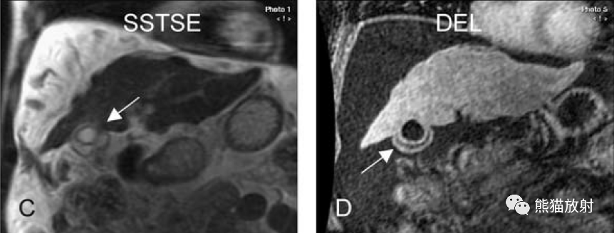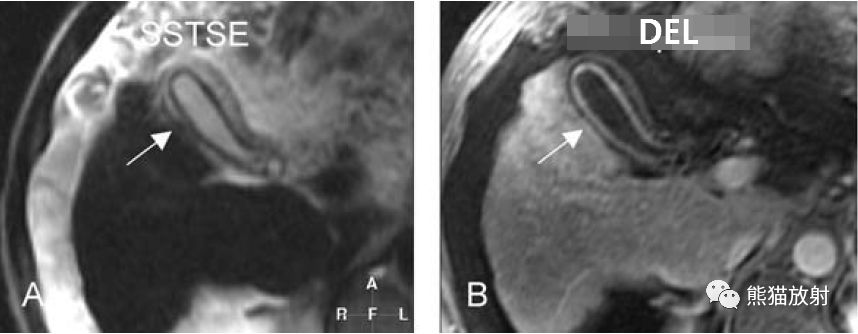 膽囊壁增厚(并肝硬化、門(mén)脈高壓、腹水)。T2WI顯示膽囊壁因水腫而光滑均勻增厚,增強(qiáng)延遲期顯示強(qiáng)化的膽囊壁(內(nèi)外兩層:粘膜層和漿膜層),薄而清晰光滑。