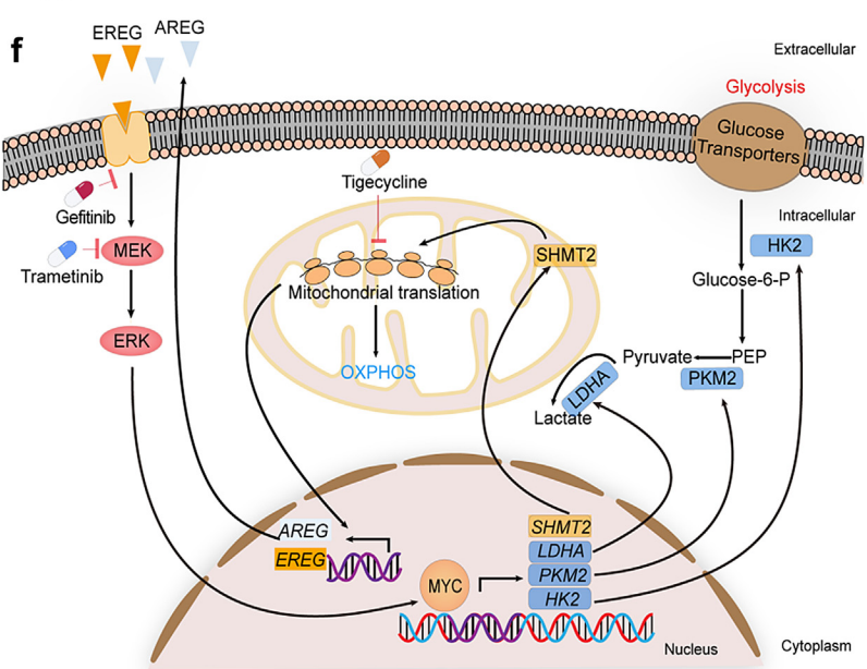 為了進一步闡明肝癌細(xì)胞耐受替加環(huán)素作用的分子機制,研究團隊對替加環(huán)素處理的肝癌細(xì)胞進行了轉(zhuǎn)錄組測序、受體酪氨酸激酶陣列分析及酶聯(lián)免疫吸附測定,發(fā)現(xiàn)替加環(huán)素不敏感肝癌細(xì)胞在替加環(huán)素作用下,EGFR的兩種配體AREG和EREG自分泌增多并激活EGFR-ERK1/2信號通路,進而導(dǎo)致MYC下游糖酵解相關(guān)酶己糖激酶2(HK2)、丙酮酸激酶2(PKM2)和乳酸脫氫酶(LDHA)表達及活性增強。此外,研究團隊還發(fā)現(xiàn)EGFR-ERK1/2-MYC信號軸可通過激活絲氨酸羥甲基轉(zhuǎn)移酶2(SHMT2)部分維持線粒體翻譯功能。