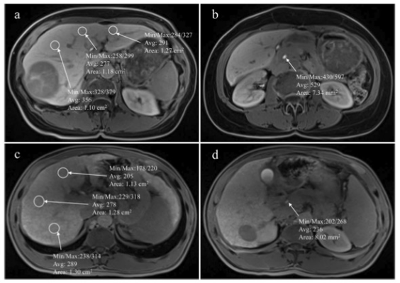 圖 MR圖像顯示了在肝膽期測(cè)量肝臟和膽道系統(tǒng)的信號(hào)強(qiáng)度感興趣區(qū)域的位置。a和b選自一名沒(méi)有出現(xiàn)肝切除術(shù)后肝衰竭的患者。c和d選自一名肝切除術(shù)后出現(xiàn)肝衰竭的患者