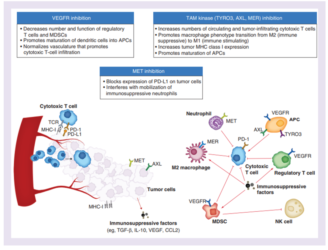卡博替尼靶向參與腫瘤發(fā)病機制的多受體酪氨酸激酶,包括促血管生成生長因子VEGFR和MET以及TAM激酶家族(酪氨酸3,AXL,MER),有助于解除腫瘤微環(huán)境中的免疫抑制環(huán)境。