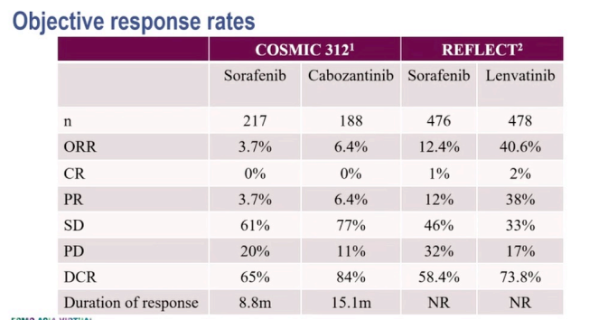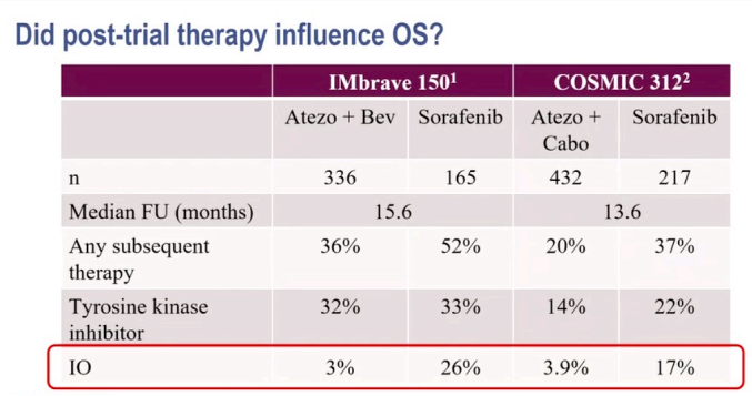 COSMIC-312是第一個旨在評估酪氨酸激酶抑制劑聯(lián)合免疫檢查點抑制劑雙藥系統(tǒng)全身治療晚期肝癌一線患者的III期隨機對照試驗(RCT),試驗組為卡博替尼(具有VEGFR2、c-Met、AXL和RET的廣泛抑制特性)聯(lián)合阿替利珠單抗(抗PD-L1單抗),對照組為索拉非尼。盡管mPFS優(yōu)勢明顯,但mOS沒有改善,最終以失敗告終。也發(fā)讓人深思,為何mOS會沒有差異,且聯(lián)合治療組的總體反應率較低(432例中有47例[11%]),這表明每種藥物的單藥活性可能不足以保證臨床的協(xié)同效應