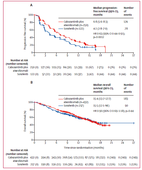 該研究采用雙終點,即由盲態(tài)獨立評審委員會(BIRC)先對前372名隨機分配到卡博替尼聯(lián)合阿替利珠單抗組或索拉非尼組ITT人群的PFS(RECIST 1.1)以及所有患者的OS。