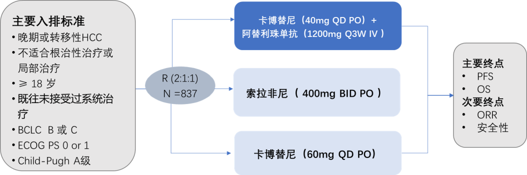 COSMIC-312試驗(NCT03755791)是一項開放標簽、隨機、III期臨床試驗,納入的患者來自32個國家,178個中心,年齡≥18歲晚期肝癌患者,之前未接受系統(tǒng)抗腫瘤治療和跟機制治療或局部治療,共計有837例。