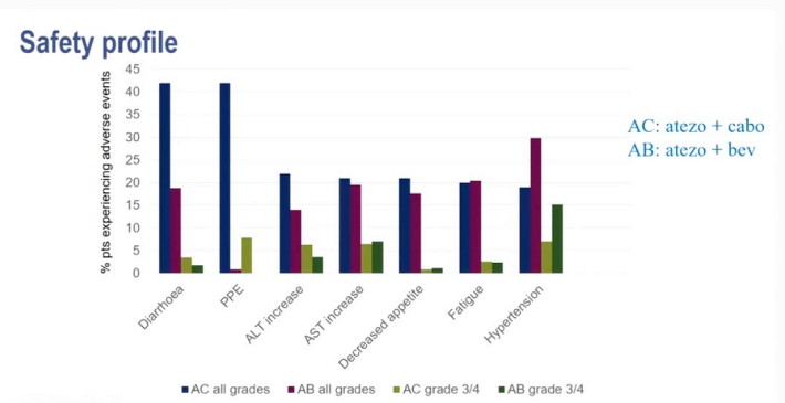 聯(lián)合治療組有17(4%)名患者接受了免疫檢查點抑制劑,而索拉非尼組有36(17%)名患者接受了免疫檢查點抑制劑,單藥卡博坦尼組有24(13%)名患者接受了免疫檢查點抑制劑