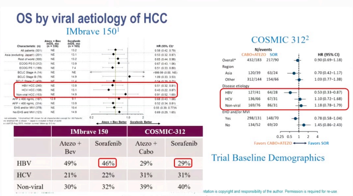 那這種情況,在COSMIC-312試驗中也是如此。雖然整體OS數(shù)據是失敗的,但在ITT人群的HBV亞組(n=191),卡博替尼+阿替利珠單抗組和索拉非尼單藥組的mOS分別為18.2個月和14.9個月(HR 0.53;95%CI:0.33~0.87);在HCV亞組(n=203),兩組的中位OS分別為13.6個月和14.0個月(HR 1.10;95%CI:0.72~1.68);在非病毒組(n=255),兩組的中位OS分別為15.2個月和未達到(HR 1.18:95%CI:0.78~1.79)。也驗證了HBV感染導致的HCC更能從免疫聯(lián)合治療中獲益。
