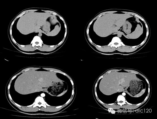 患者,女,50歲,農(nóng)民。 因右上腹疼痛1月余,外院B超診斷為肝癌入我院治療。既往無肝炎病史,無飲酒史,無遺傳病史,無高血壓糖尿病史。 體檢:神志清楚,正力體型,皮膚鞏膜無黃染;心肺聽診未見異常;腹軟,肝脾肋下未及,腹水征陰性,雙下肢無水腫。 入院后輔助檢查:甲胎蛋白正常,肝功能正常,血常規(guī)正常,便常規(guī)見膿球1~3個(gè),HBV和HCV相關(guān)病原學(xué)檢查陰性。 CT檢