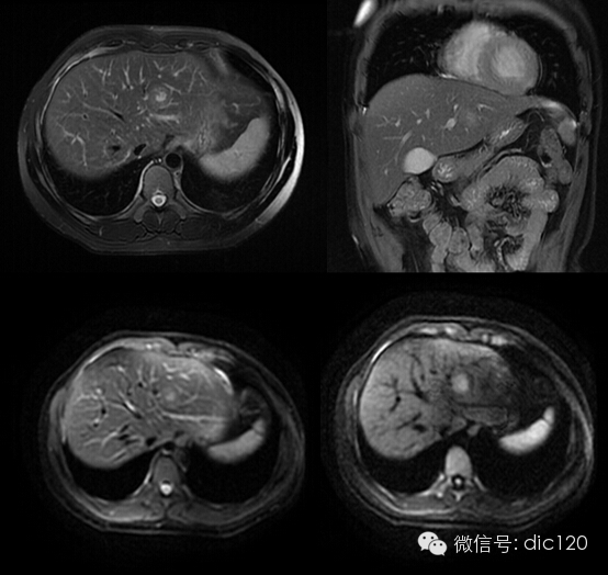 纖維板層型肝癌:可出現(xiàn)中央瘢痕,但其較FNH的明顯粗大,并可見斑點(diǎn)狀鈣化,T1WI、T2WI均為低信號(hào),無強(qiáng)化。