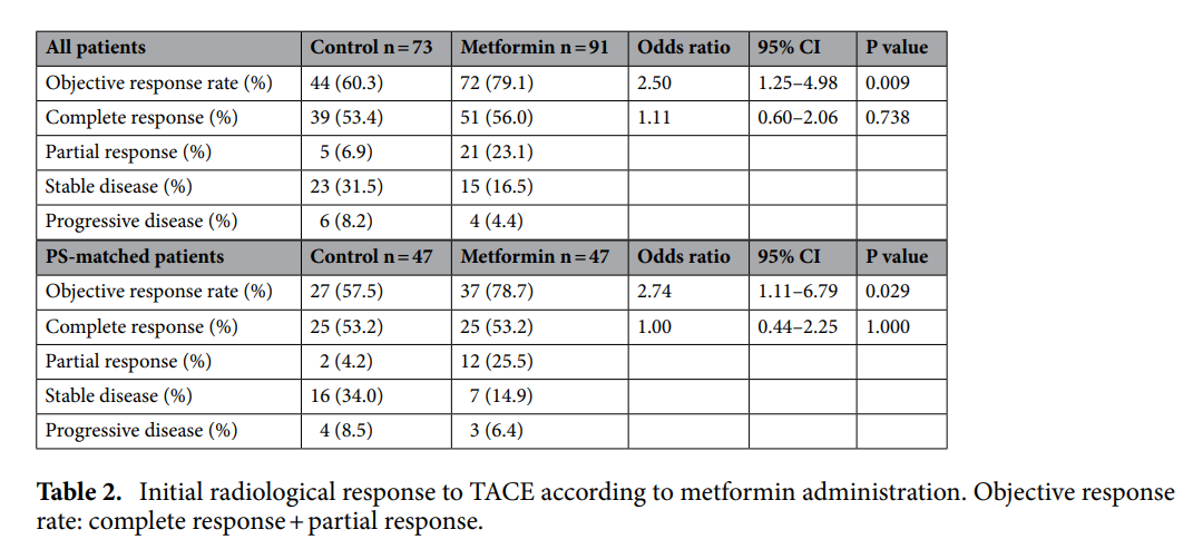 表2顯示初始 TACE 后 4 周根據(jù) mRECIST 標(biāo)準(zhǔn)的總體和 PS 匹配患者的放射學(xué)緩解率。二甲雙胍組的客觀緩解(即完全緩解(CR)和部分緩解(PR)之和)率顯著高于對(duì)照組: