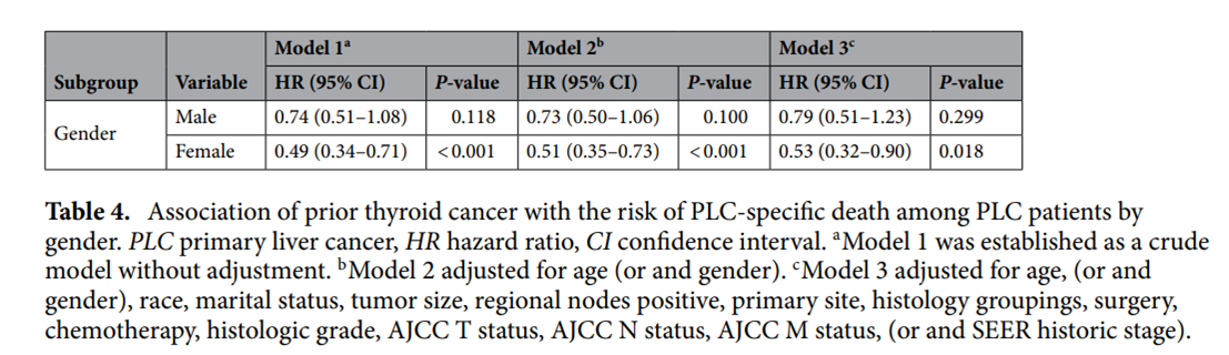 按性別分層的亞組分析顯示,女性患者與PLC的關(guān)系相似:既往甲狀腺癌女性患者的PLC死亡風(fēng)險較低(HR = 0.49;95% CI:0.34–0.71,P < 0.001)。在模型2中,這種差異在上述亞組中仍然顯著。在模型3中,既往甲狀腺癌的潛在保護作用僅在PLC女性患者中發(fā)現(xiàn)(HR = 0.53;95%CI:0.32-0.90,P = 0.018)(表4)。