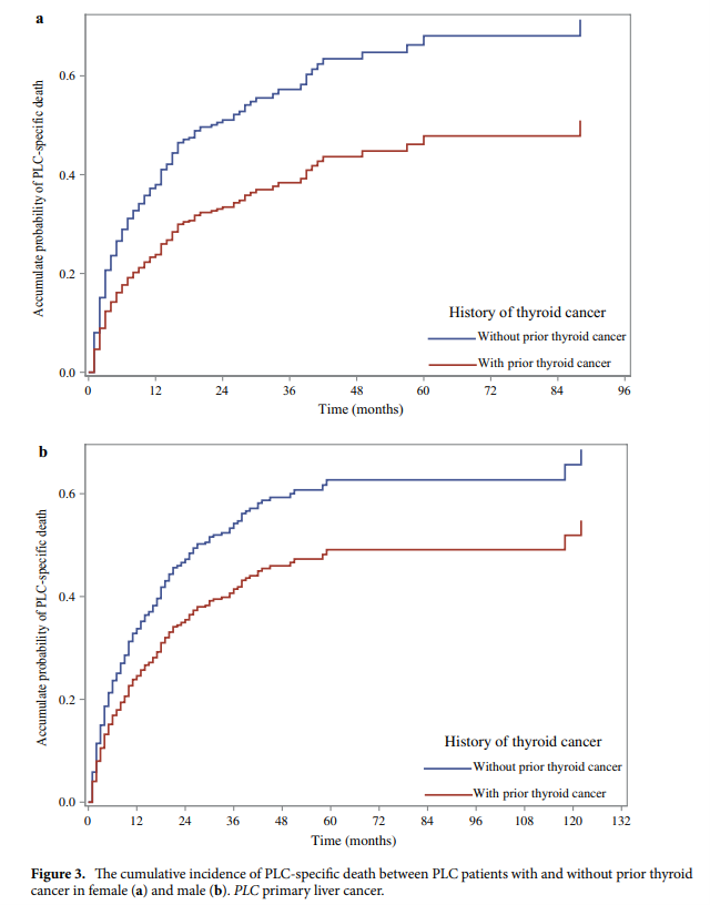 圖3a描述了有和沒有既往甲狀腺癌的女性PLC患者之間PLC特異性死亡的累積發(fā)生率。圖3b顯示了有和沒有先前甲狀腺癌的PLC患者之間PLC特異性死亡的累積發(fā)生率。既往甲狀腺癌可能是PLC患者肝癌死亡的保護因素,尤其是女性患者。