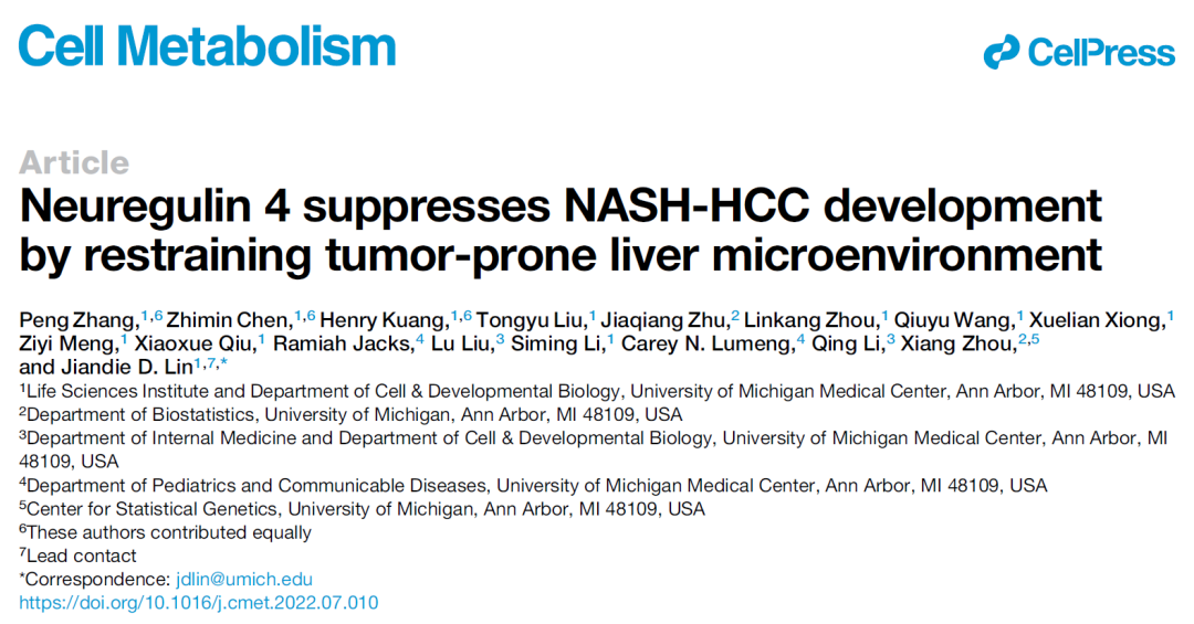 2022年8月15日,密歇根大學(xué)醫(yī)學(xué)中心林建諜教授團(tuán)隊在 Cell 子刊 Cell Metabolism 上發(fā)表了題為:Neuregulin 4 suppresses NASH-HCC development by restraining tumor-prone liver microenvironment 的研究論文。