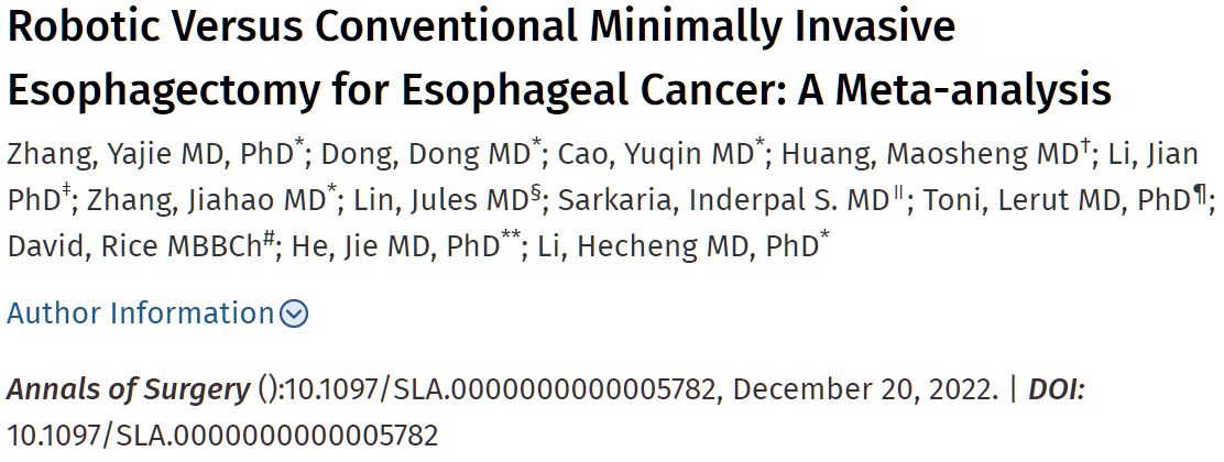 Zhang Yajie,Dong Dong,Cao Yuqin et al. Robotic Versus Conventional Minimally Invasive Esophagectomy for Esophageal Cancer: A Meta-analysis.[J] .Ann Surg, 2022, https://doi.org/10.1097/SLA.0000000000005782