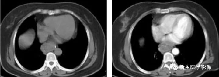 ④轉(zhuǎn)移:以縱隔、肺門(mén)及頸部淋巴結(jié)轉(zhuǎn)移多見(jiàn),也可逆行性轉(zhuǎn)移至上腹部淋巴結(jié),少見(jiàn)肺轉(zhuǎn)移。CT增強(qiáng)掃描可見(jiàn)瘤體輕度強(qiáng)化。較大瘤體呈不均勻強(qiáng)化,常合并低密度的壞死灶,較小瘤體強(qiáng)化均勻。