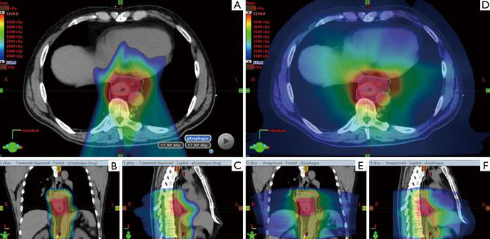 但是,研究證實(shí)使用光子放療與食管癌患者出現(xiàn)心肺毒性和晚期不良反應(yīng)有關(guān),而且食管癌患者出現(xiàn)的心肺毒性會影響食管癌治療中胸部高劑量放射的管理。同時,食管癌同步放化療后可能出現(xiàn)局部復(fù)發(fā)和區(qū)域復(fù)發(fā)。因此在避免心臟、肺部放射劑量的同時增加靶區(qū)劑量是改善食管癌治療結(jié)果的合理方法。