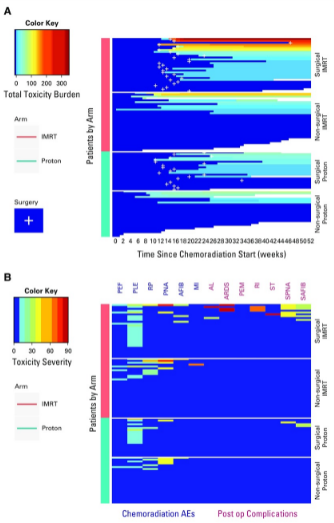 ▲IMRT與質(zhì)子治療食管癌的總毒性負(fù)擔(dān)對比,