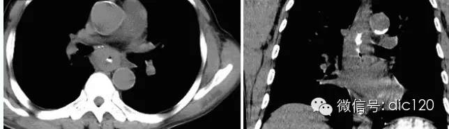 與食管靜脈曲張相鑒別:后者常有肝硬化、門脈高壓病史,食管壁柔軟,粘膜正常,CT增強掃描可見明顯強化的迂曲血管團,呈持續(xù)、延遲性強化。MRI:由于流空效應(yīng),曲張的血管在T1WI及T2WI上均呈低信號,增強掃描靜脈期病灶明顯強化。CT三維重建及MRI血管重建可以清晰顯示曲張血管的全貌。