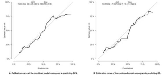 圖 所有隊(duì)列中列線圖的校準(zhǔn)曲線。A聯(lián)合模型提名圖預(yù)測(cè)DFS的校準(zhǔn)曲線。B聯(lián)合模型提名圖預(yù)測(cè)OS的校準(zhǔn)曲線