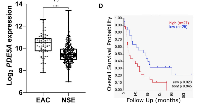 在這項(xiàng)研究中,研究團(tuán)隊(duì)發(fā)現(xiàn),與健康的食管組織相比,食管腺癌細(xì)胞中5-磷酸二酯酶(PDE5)顯著高表達(dá),而在腫瘤微環(huán)境中的癌癥相關(guān)成纖維細(xì)胞(CAF)同樣高表達(dá) PDE5。同時(shí),PDE5 的高表達(dá)與較差的總生存率相關(guān),這表明 PDE5 可能是一個(gè)有效的食管腺癌治療靶點(diǎn)。